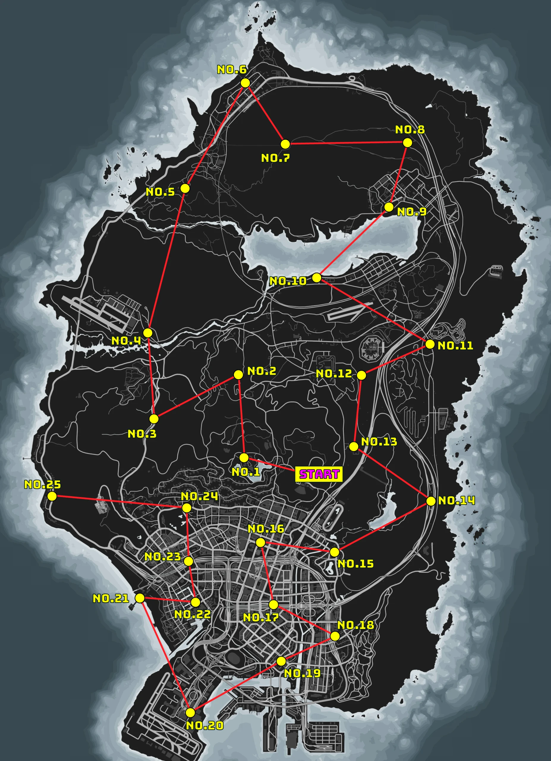 邸宅(バインウッド・レジデンス)をスタートとした場合、最も移動距離が少なくなるルート順に記載しています。No.1から順に収集していくことをお勧めします。但し、空での移動を前提とした収集順なので車で移動する場合は逆に遠回りになる可能性があります。