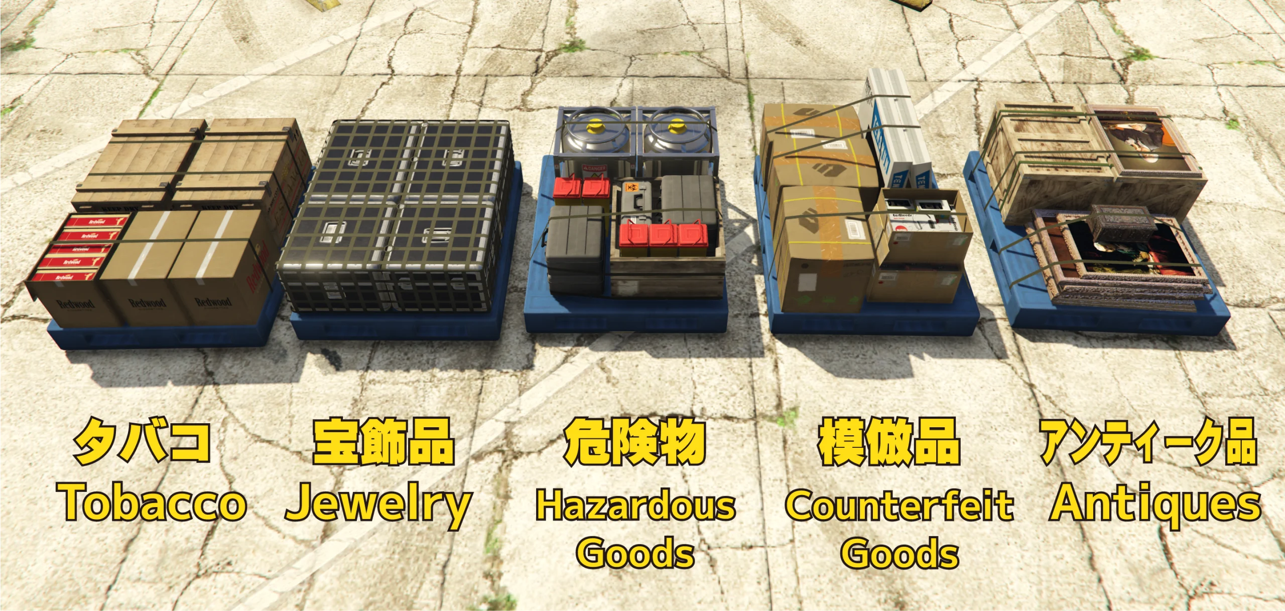 ロスサントス空港近くにあるアルファメールの物流倉庫内でフォークリフトに乗ってピッキング作業を行う。倉庫内には以下の5種類の物品が各3個ずつの計15個配置されている。